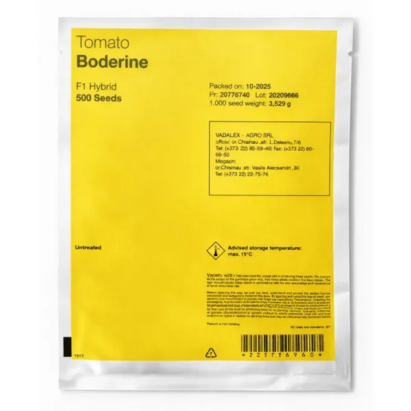 Boderine F1 (Syngenta) este un hibrid de tomate timpuriu, cu creștere nedeterminată, recomandat pentru cultivare atât în spații protejate (solar, seră), cât și în câmp deschis, în ciclurile primăvară–vară și vară–toamnă. Se remarcă prin legare foarte bună în condiții dificile, uniformitate ridicată și rezistență la crăpare.