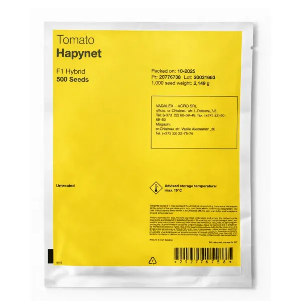 Hapynet F1 (Syngenta) este un hibrid de tomate roz, timpuriu, cu creștere determinată, recomandat în special pentru cultivarea în câmp deschis. Hibridul se evidențiază prin robustețea plantei, adaptabilitate foarte bună la condiții de stres și producții ridicate, chiar și în condiții climatice nefavorabile.