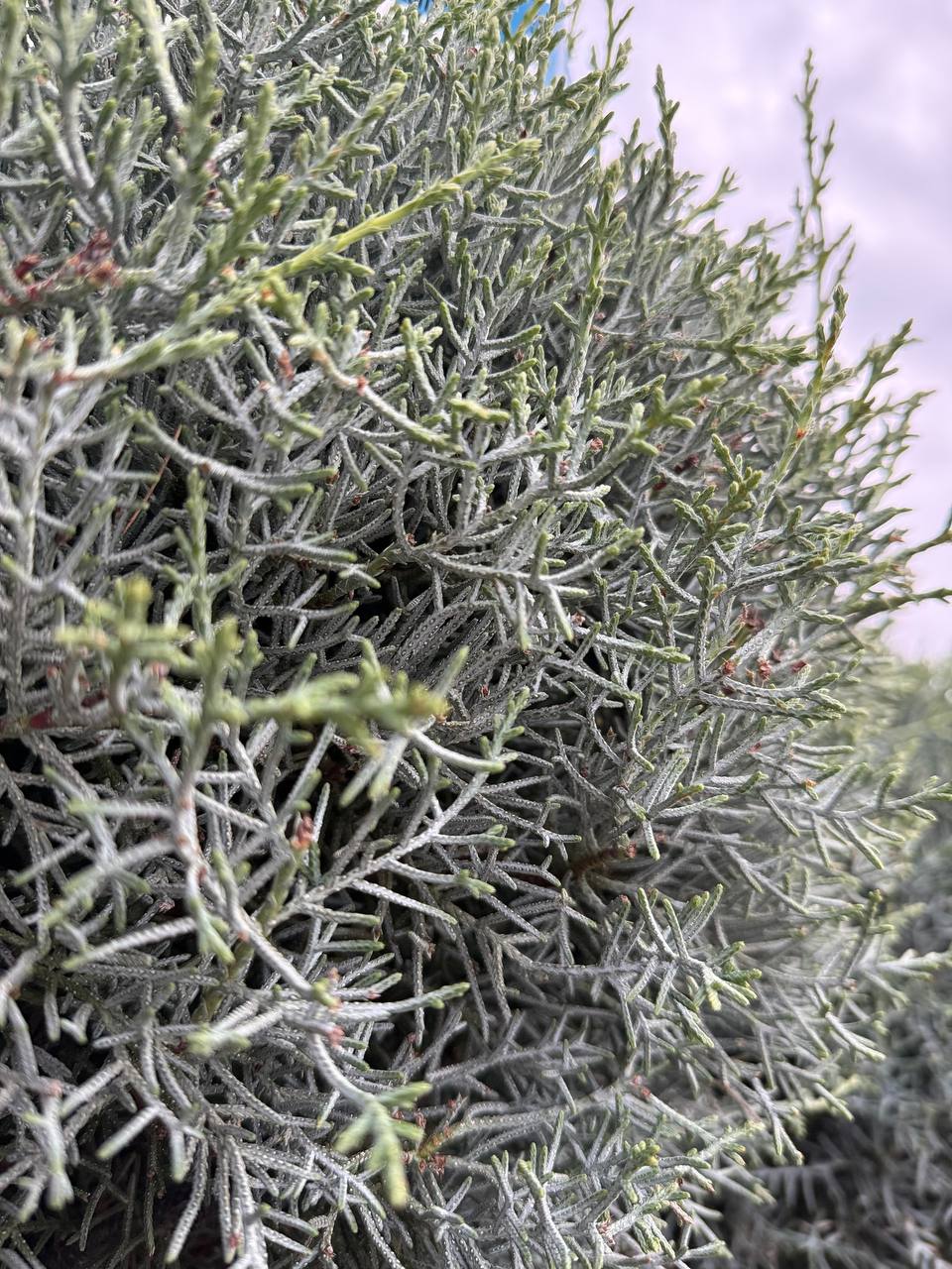 Ramurile au o crestere verticala, compacta de la tulpină, sunt îmbracate în frunzis de o culoare spectaculoasa, gri-albastrui metalic, parfumat. Fructele sunt de culoare gri-albastrui.