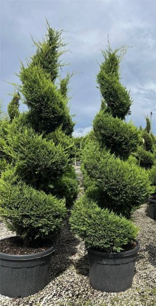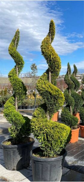 Leylandii Gold Rider Spirală (Cupressocyparis leylandii ‘Gold Rider’) este un conifer decorativ, veșnic verde, cu frunziș dens de culoare galben-aurie, modelat special într-o formă spiralată elegantă. Această formă este obținută prin tunderi succesive, ceea ce îl transformă într-un element ornamental spectaculos, ideal pentru grădini, alei, terase sau spații verzi cu design modern și rafinat.