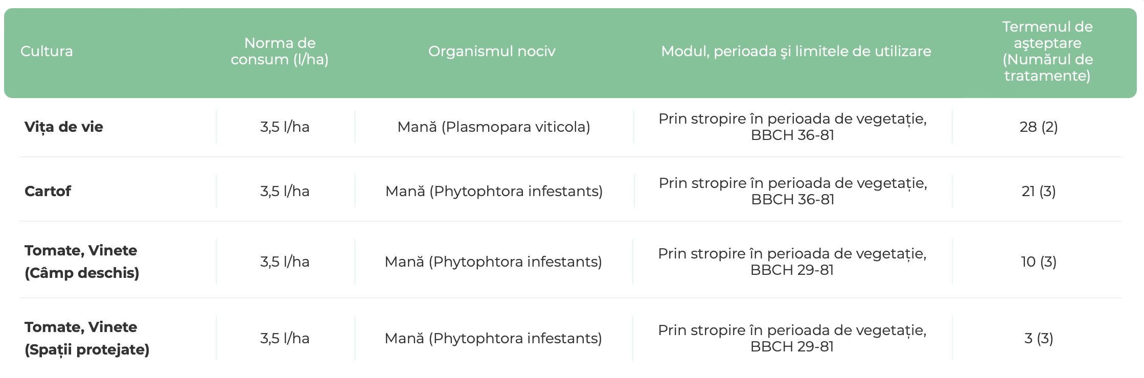 - Pentru aceeași suprafață tratată, conține mai mult Metalaxyl-M și mai puțin cupru decât alte formulări lichide de pe piață.