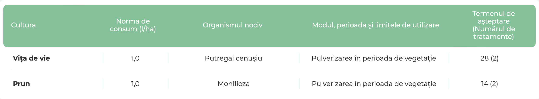 • Compatibilitate extinsă cu majoritatea pesticidelor și fertilizanților, asigurând o integrare ușoară în programele de protecție a plantelor.
