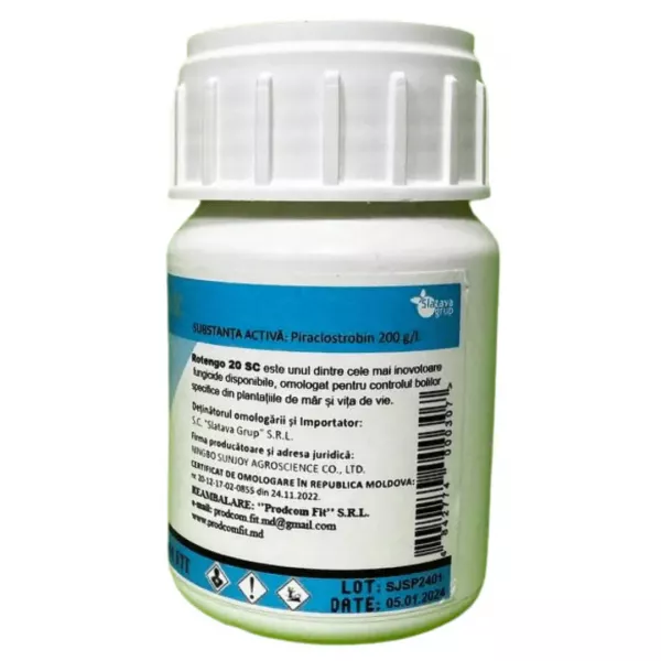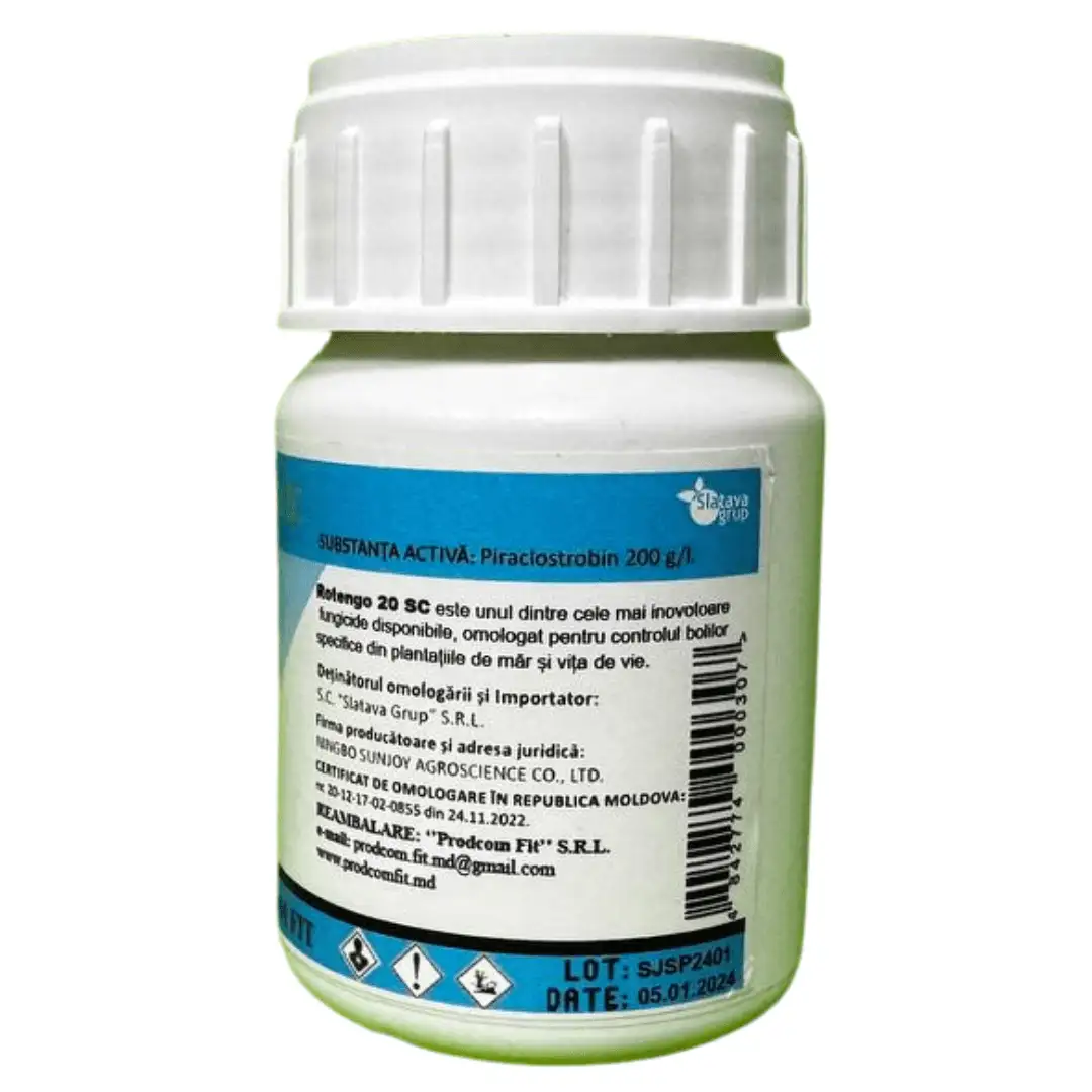 Rotengo 20 SC este un fungicid cu acțiune protectivă, curativă și eradicativă. Piraclostrobin este o substanță activă din familia strobilurinelor cu acțiune translaminară și sistemie locală, ce inhibă germinația sporilor și controlează creșterea micelului și sporularea.