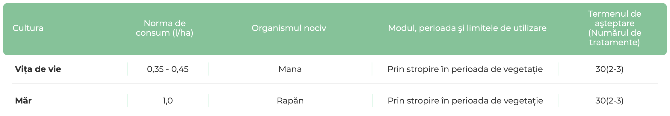 Măr - Cel mai bun moment pentru a utiliza produsul împotriva crustei mărului este aplicarea înainte și după înflorire în combinație cu produse sistemice, deoarece această perioadă este perioada principală pentru infecția plantelor.