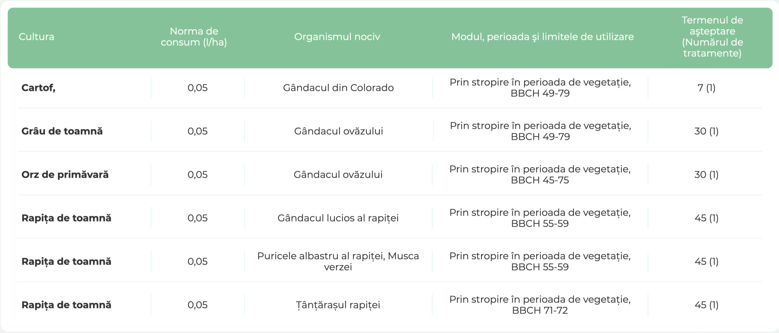 DELMETROS 100 SC actionează prin contact și ingestie asupra insectelor dăunătoare, atât în stadiul de larvă cât și adulți.