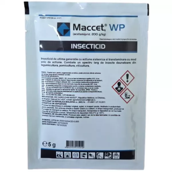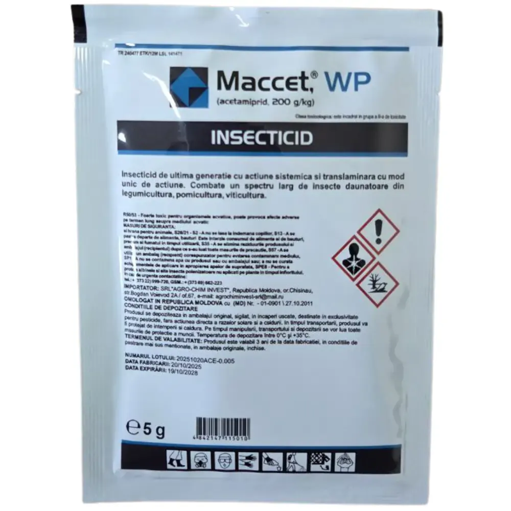Maccet WG este un insecticid sistemic, pe bază de acetamiprid, din grupa produselor neonicotinoide. Acetamiprid acționează asupra sistemului nervos central, interferând în transmiterea impulsurilor nervoase.