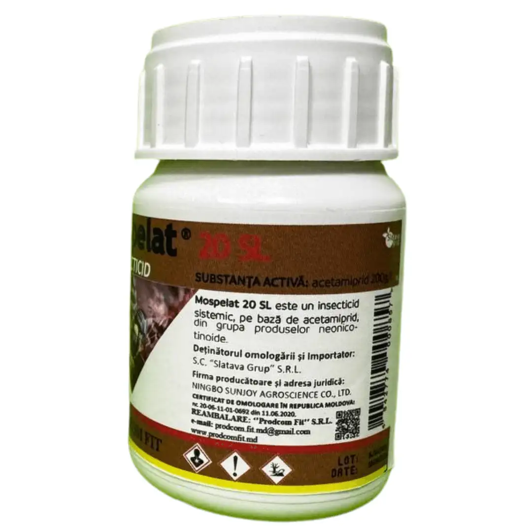 Mospelat 20 SL este un insecticid sistemic, pe bază de acetamiprid, din grupa produselor neonicotinoide. Acetamiprid acționează asupra sistemului nervos central, interferând în transmiterea impulsurilor nervoase.