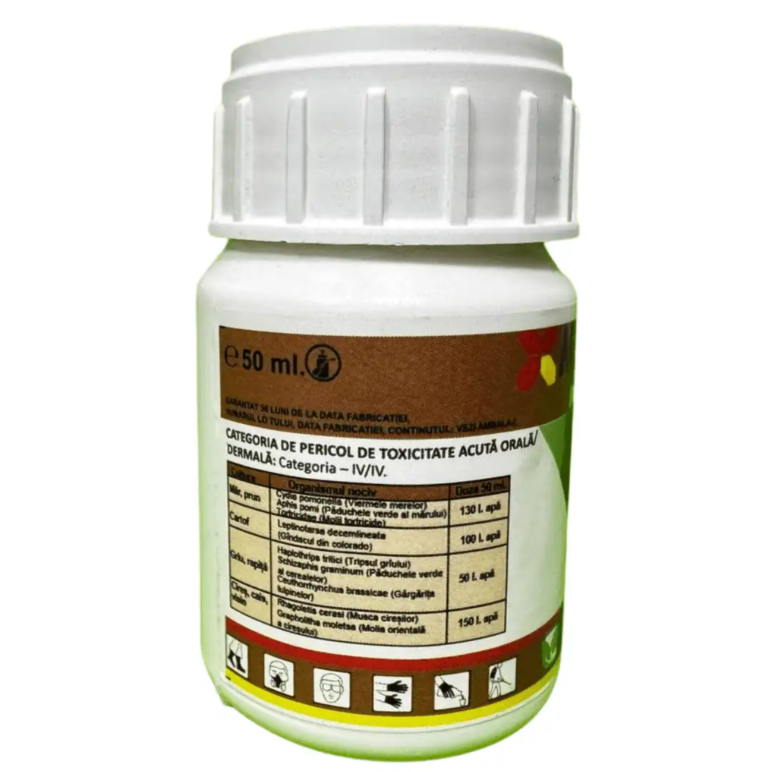 | Dăunători | Omida mărului. Viermele frunzei. Afide. Viespi defoliatoare. Viespea semințelor de prun. Păduchele cenușiu al prunului. Viermele prunelor. Gândacul colorado. Musca. Afidele negre. Omida fructelor de est. Molia florilor de rapiță. Trips. Păduchele cerealelor. Cicădelă. Omidă. Puricii negri și albaștri . |