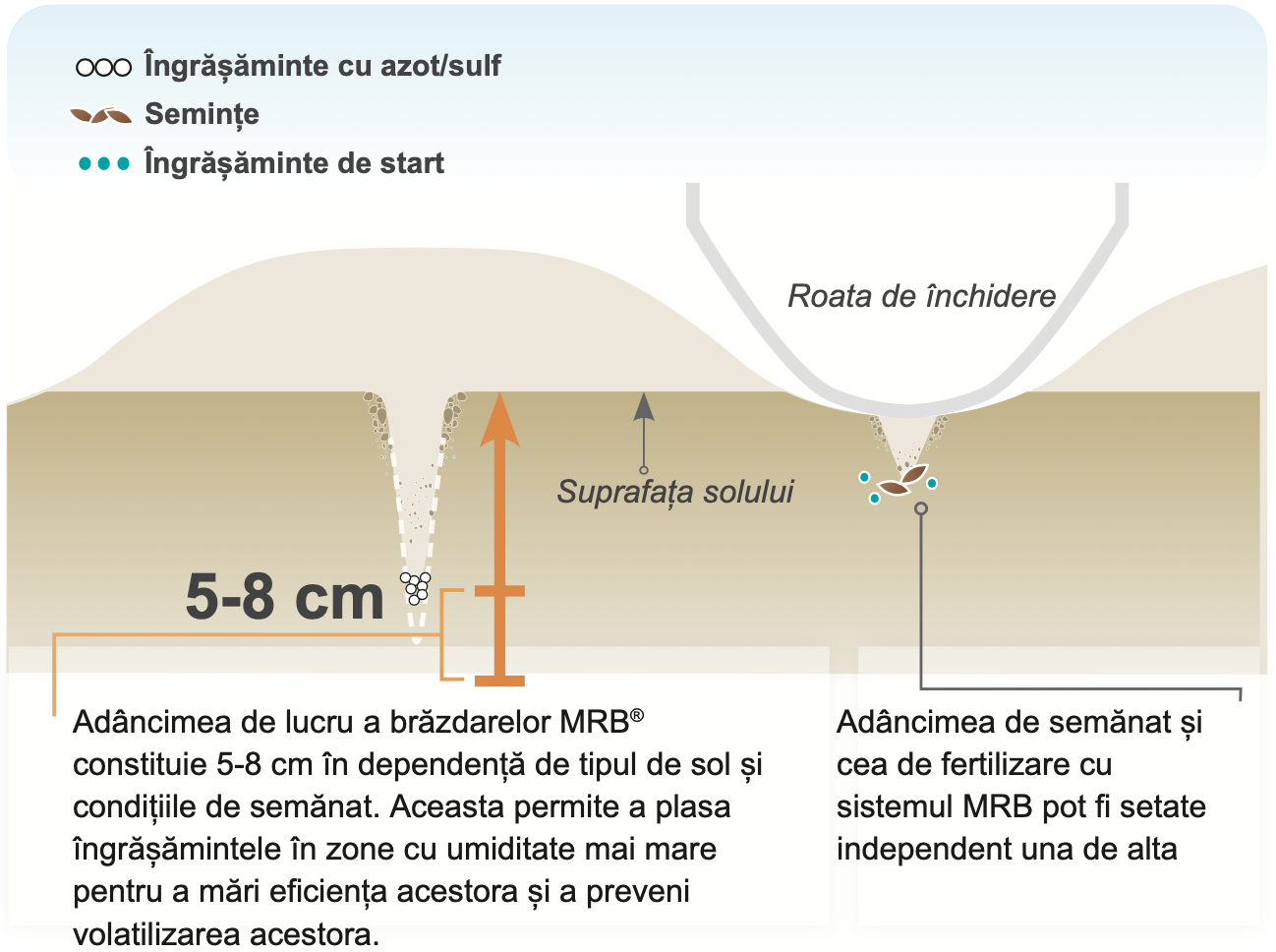 Sistemul MRB® face posibilă introducerea îngrășămintelor cu azot și sulf (în doze mari, la necesitate) între rânduri la o distanță optimă de semințe, creând condiții favorabile pentru dezvoltarea sistemului radicular și contribuind la formarea unui pat germinativ de înaltă calitate.