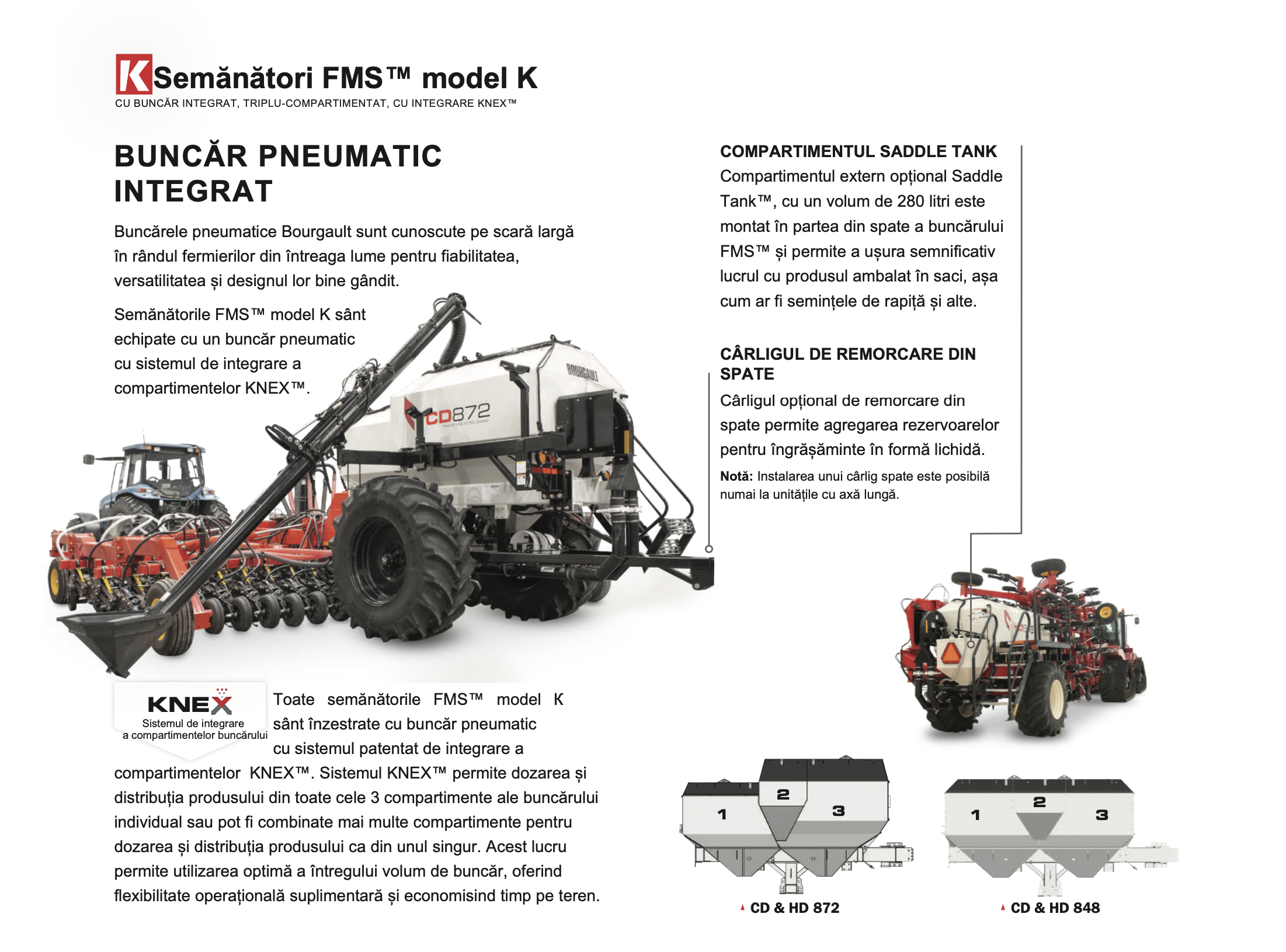 Complexurile de însămânțare Bourgault FMS din seria K sunt formate dintr-o secțiune de însămânțare cu brăzdare cu discuri sau cu ancore ParaLink și un buncăr pneumatic din oțel, dotat cu sistemul de integrare a secțiunilor KNEX.